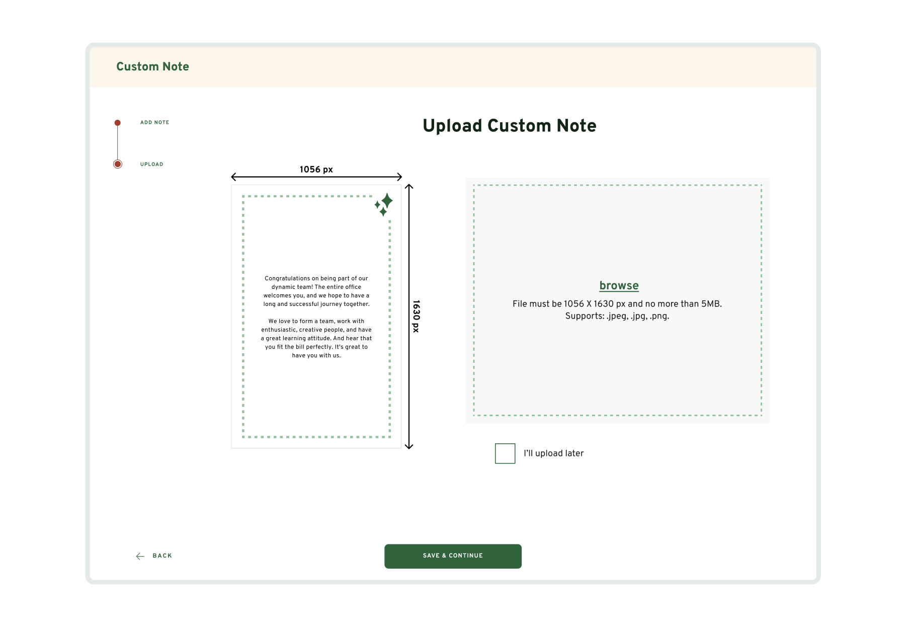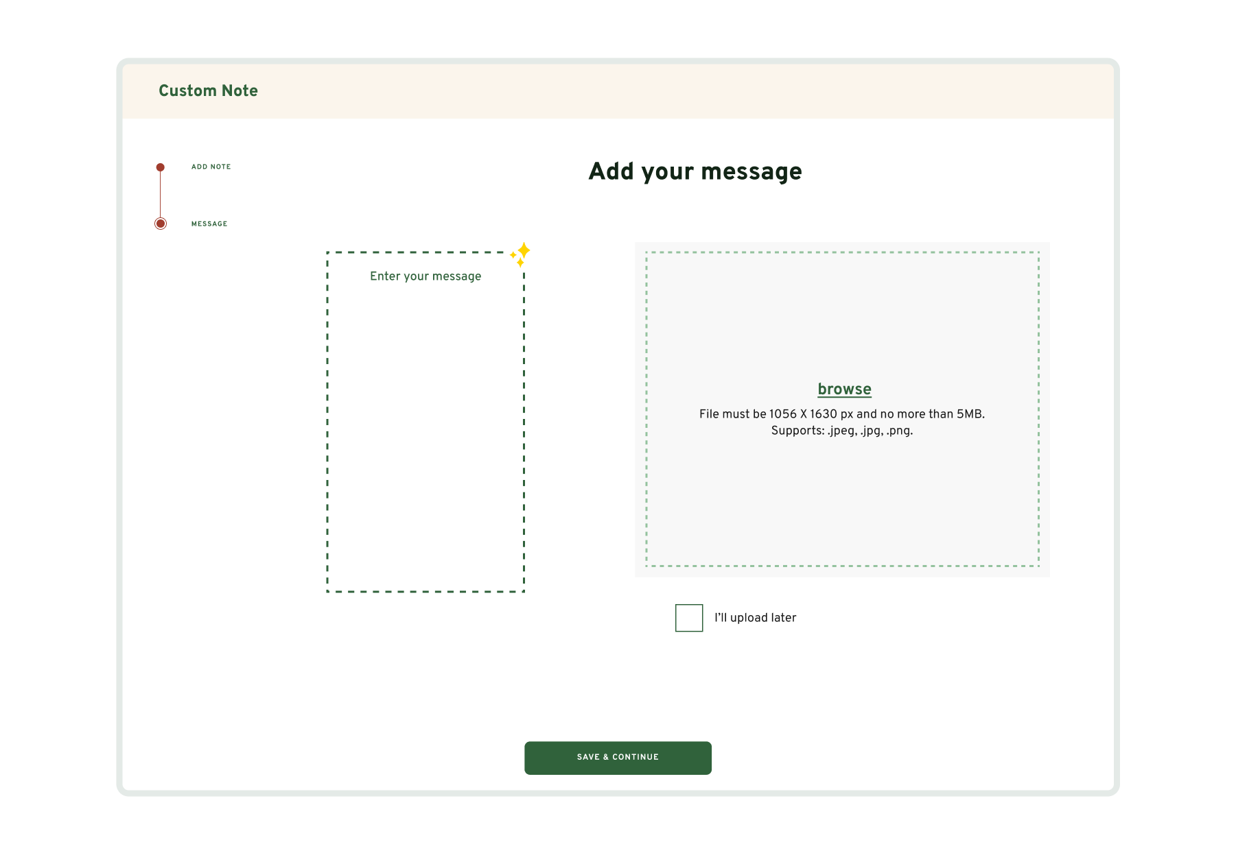 Upload your custom note image to the treat form. There’s a desired specification for 1056*1630 px. You could also choose to upload it later from the order confirmation page by ticking the 'I'll upload later' checkbox.