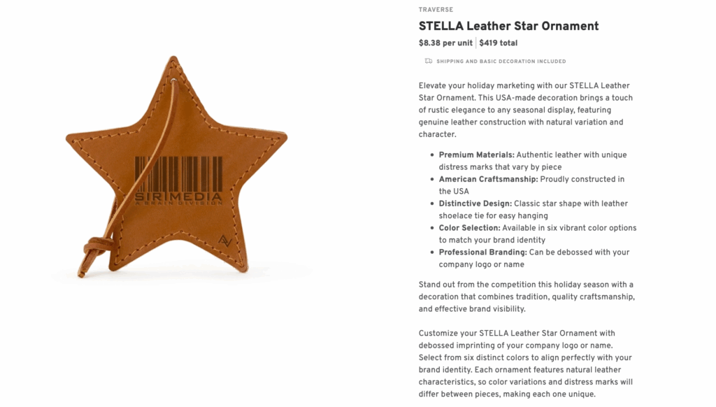 Some gifts feel a little more special, and this STELLA Leather Star Ornament is one of them. Imagine surprising a coworker with an elegant and customizable holiday ornament with your logo or a short note of gratitude. It’s sleek, timeless, and the perfect ornament for adding a personal touch to tree decorations. Ready to package for holiday parties, it doubles as a keepsake and a thank-you gift your colleague will truly cherish.
