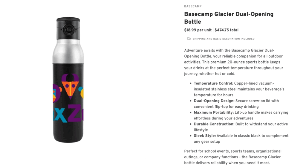 Celebrate the season of giving with the Basecamp Glacier Dual-Opening Bottle! This 20-ounce, vacuum-insulated bottle keeps drinks hot or cold for hours, perfect for winter mornings or outdoor holiday adventures. Its dual-opening design and durable build make it both stylish and practical. Personalize with your company logo or holiday message for a gift that shows appreciation and spreads festive joy, making your employees feel valued this holiday season.
