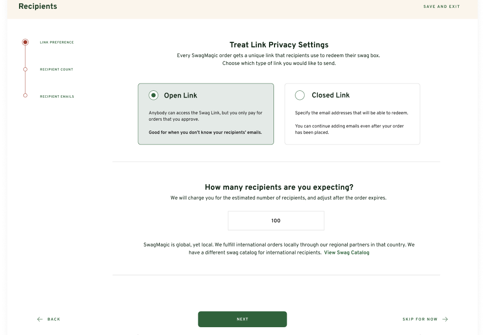 While creating your order, when prompted for recipients, select "Leave my link open for new people" and give us an estimate for the number of recipients. These can be WFH employees, work from anywhere employees, event attendees, or anyone you choose.