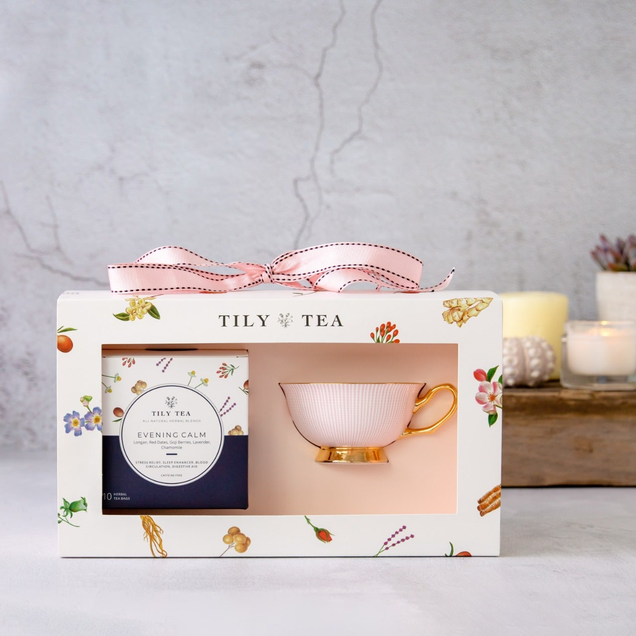 Spoil yourself special with this gift set, a perfect treat for those who like to savor the soothing moments of tea time. Nestled inside an exquisitely designed box adorned with a pink ribbon handle, you'll discover 10 sachets of Evening Calm tea. This blend is filled with the relaxing aromas of Lavender and Chamomile flowers that top off a delicious natural sweetness from Longans, Red Dates and Goji Berries. To complete the experience, you'll also find an elegant cup and saucer set. A true embodiment of sophistication and style whether for a moment of self-indulgence or a thoughtful gesture for a loved one.