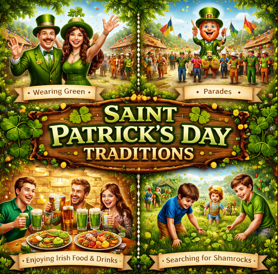 Over the years, Saint Patrick’s Day has developed a wide range of traditions that blend Irish history, folklore, and modern celebrations. From wearing green clothing to attending lively parades and enjoying traditional Irish meals, these customs help bring the spirit of the holiday to life.