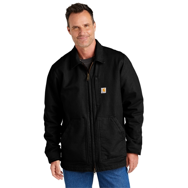 The Carhartt Sherpa-Lined Coat combines classic Carhartt style with legendary durability. Made with signature 12-ounce, 100% ring spun cotton washed duck fabric for a tough exterior, this loose-fit coat keeps you warm with its soft sherpa-lined body.
