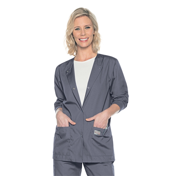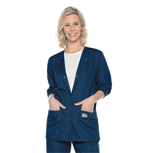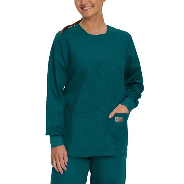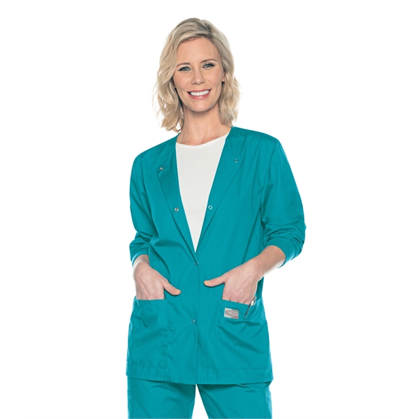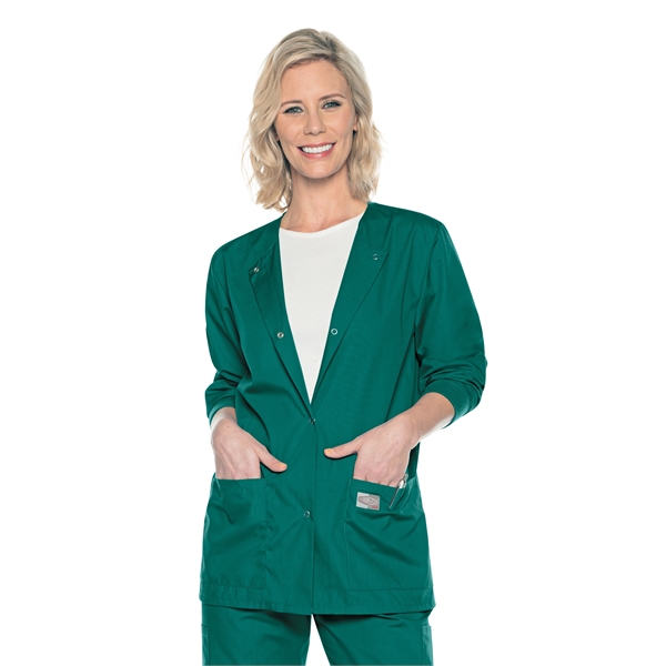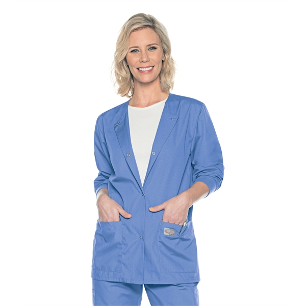 The Landau ScrubZone Women's Warm Up Scrub Jacket is the perfect practical layer for healthcare professionals on the go. This no-fuss jacket features convenient snap-front closures for quick on and off during busy shifts, plus knit cuffs that stay put so sleeves never get in your way.