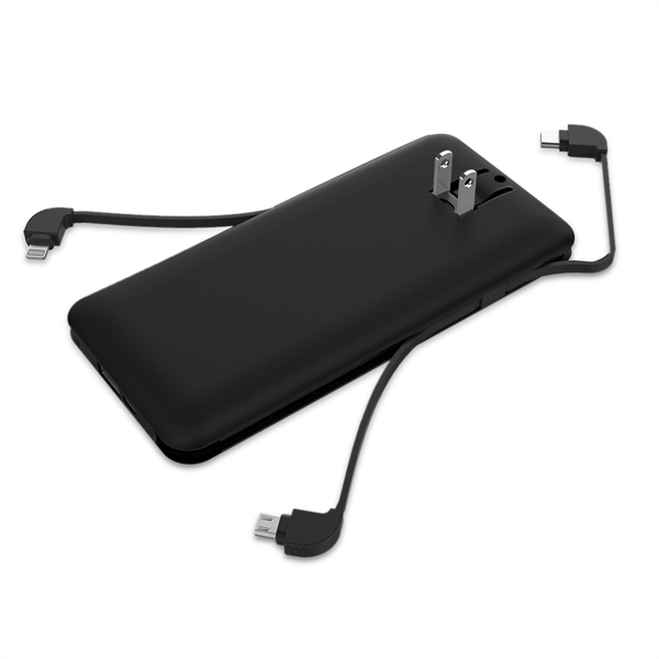 The Latham 10000mAh Power Bank is your ultimate portable charging solution, featuring built-in micro USB, USB-C, and Lightning cables plus an integrated AC wall plug for effortless charging on the go.