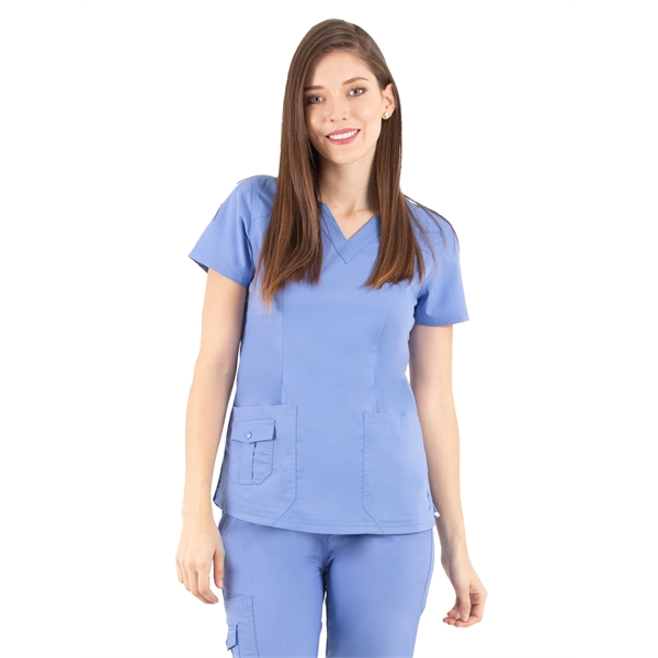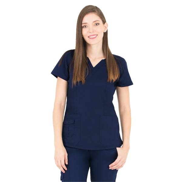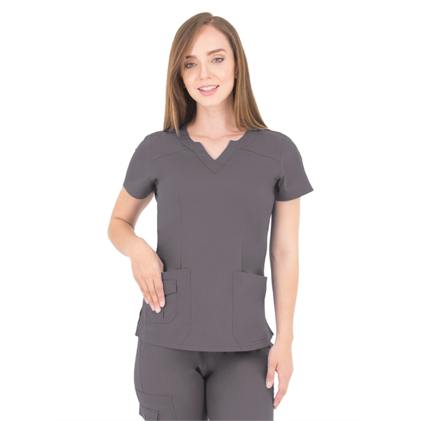 The LifeThreads Ergo 2.0 women's top combines style and functionality for healthcare professionals who want both comfort and practicality. Featuring a modern fit with a fashionable scallop neckline, this top is designed to look good while providing the storage you need throughout your shift.