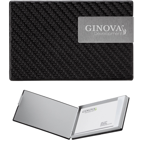The Pesaro Business Card Case combines style and functionality with its sleek carbon fiber pattern design. This professional accessory features a dedicated engraving plate that's perfect for personalizing with your name or company logo.