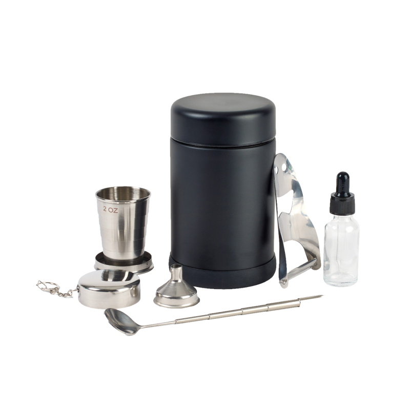 • Complete Toolkit: Includes a collapsible jigger/shot glass, telescoping bar spoon, mini funnel, TSA-compliant glass dropper bottle, and a combo peeler/zester